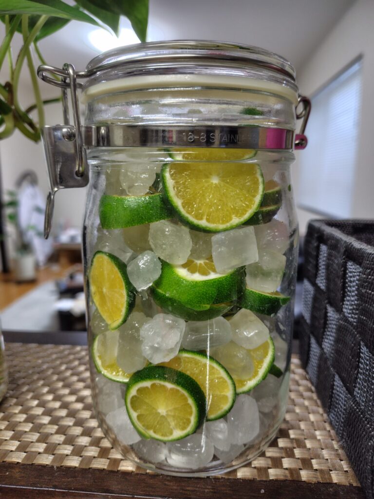 家用なので特に分量は図らず、氷砂糖→レモン→氷砂糖→レモンと交互に入れて作ります。ここで重要なのが、容器の消毒です。私は消毒用エタノールで容器を拭き、更に35度のアルコールでシャカシャカします。そして完全に乾いてから、レモンを入れます。この消毒が不完全だとカビが生えてしまうことがあります。